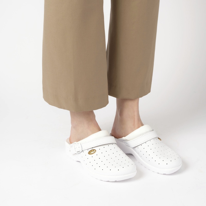 Scholl CLOG RACY je bílá pracovní obuv s anatomickou stélkou a prodyšným koženým svrškem. Certifikovaná na protiskluznost, antistatiku a absorpci energie v patě, je ideální pro zdravotníky a profesionály trávící celý den na nohou.